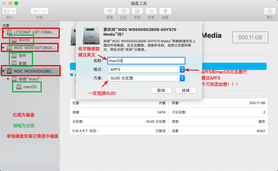 磁盘工具。选中之前分出来的空间,点击抹掉,格式选择为APFS(Mac OS 扩展日志式也可以,别选加密就好),输入一个名称(建议英文)![格式为APFS]()